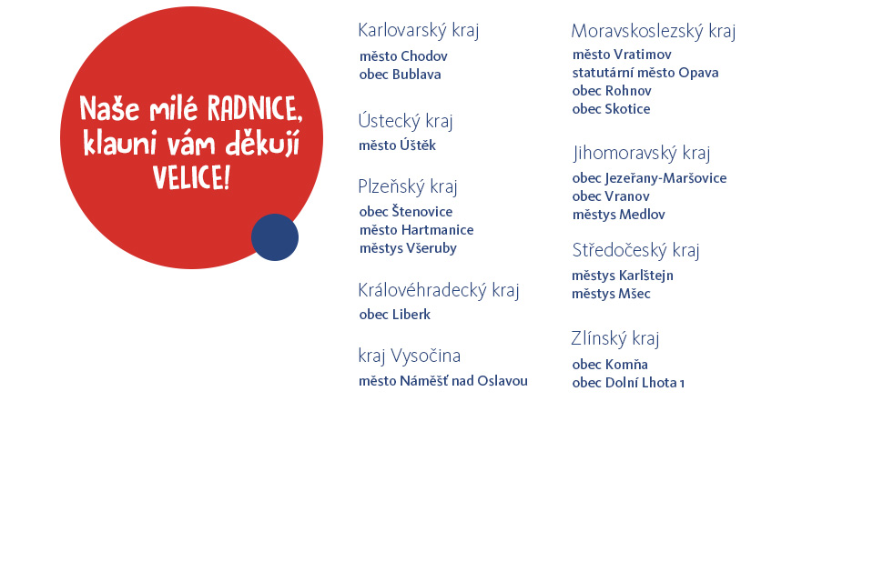 Jsme vděční, že také díky rostoucí podpoře obecních a městských úřadů, můžeme rozdávat stále více smíchu a radosti tam, kde je to nejvíce potřeba. Smíchu a radosti není nikdy moc!