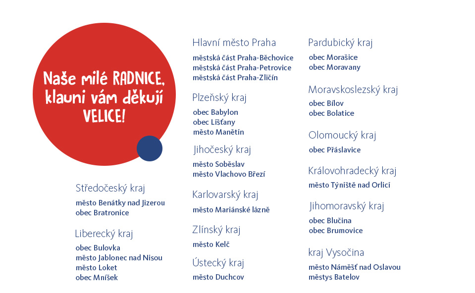 Jsme vděční, že také díky rostoucí podpoře obecních a městských úřadů, můžeme rozdávat stále více smíchu a radosti tam, kde je to nejvíce potřeba. Smíchu a radosti není nikdy moc!