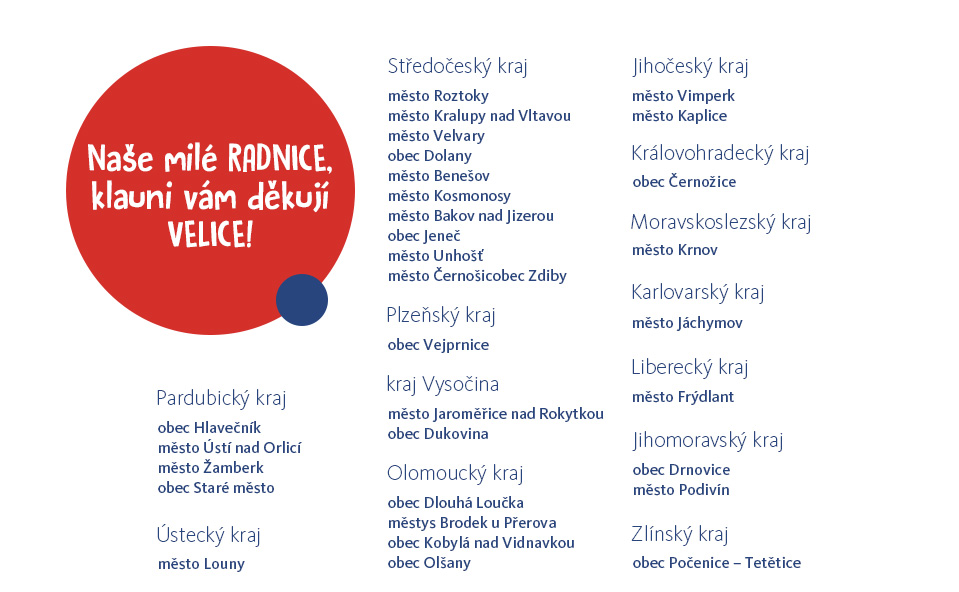Jsme vděční, že také díky rostoucí podpoře obecních a městských úřadů, můžeme rozdávat stále více smíchu a radosti tam, kde je to nejvíce potřeba. Smíchu a radosti není nikdy moc!