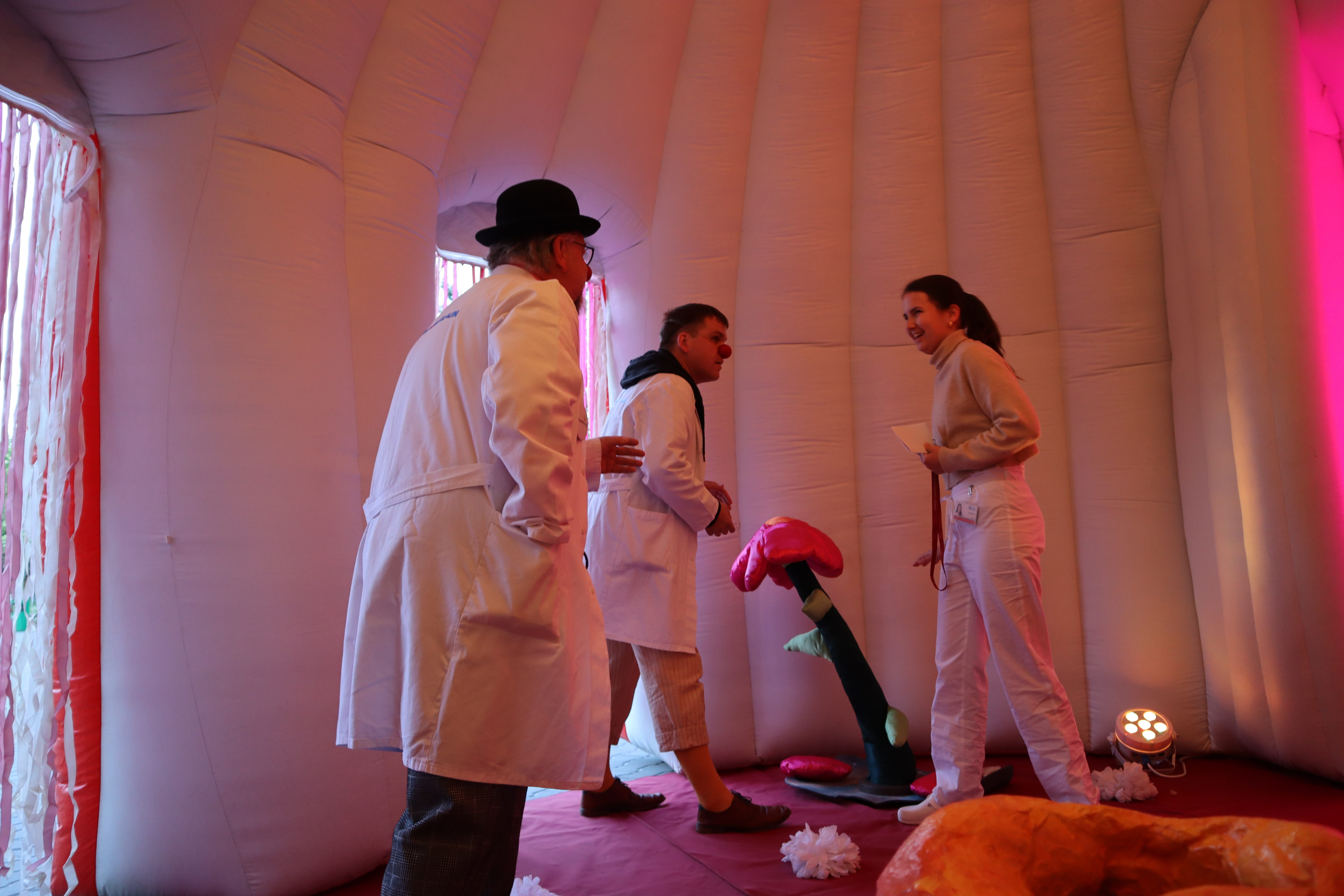 Během našich návštěv v nemocnicích a domovech nezapomínáme ani na lékaře a lékařky, zdravotní sestry a bratry, sanitáře a sanitářky a vůbec na všechny zdravotníky i nezdravotníky, kteří se o pacienty a bezproblémový chod těchto zařízení starají. V uplynulém roce jsme s nimi oslavili Mezinárodní den sester a jako poděkování za jejich obětavou práci jsme předávali ve všech našich nemocnicích a domovech drobný dárek. V osmi nemocnicích vítali Zdravotní klauni zaměstnance osobně již od brzkých ranních hodin, aby jim zpříjemnili začátek pracovního dne. Ve FN Ostrava jsme postavili speciální červený stan, tzv. Oázu radosti, ze které díky klaunům vyšel každý s úsměvem. Ve FN Motol jsme si od milých pánů z ostrahy zapůjčili prostor recepce a proměnili ho na dočasnou klaunskou kavárnu. Zdravotní klauni nabízeli motolskému personálu kromě ranní kávy třeba také básničku či písničku pro radostný začátek dne.