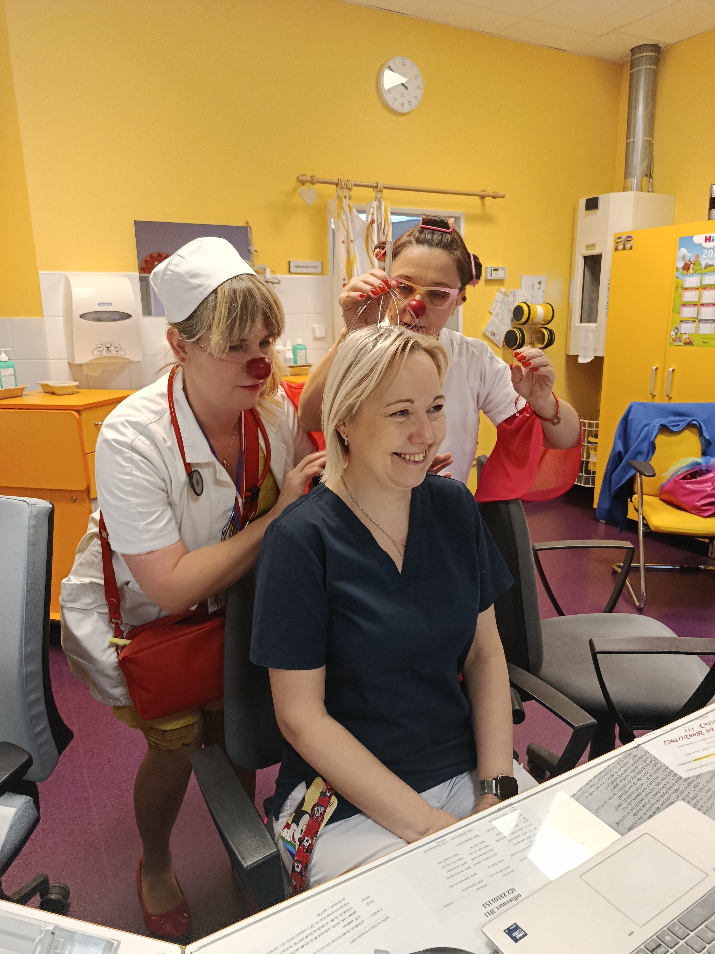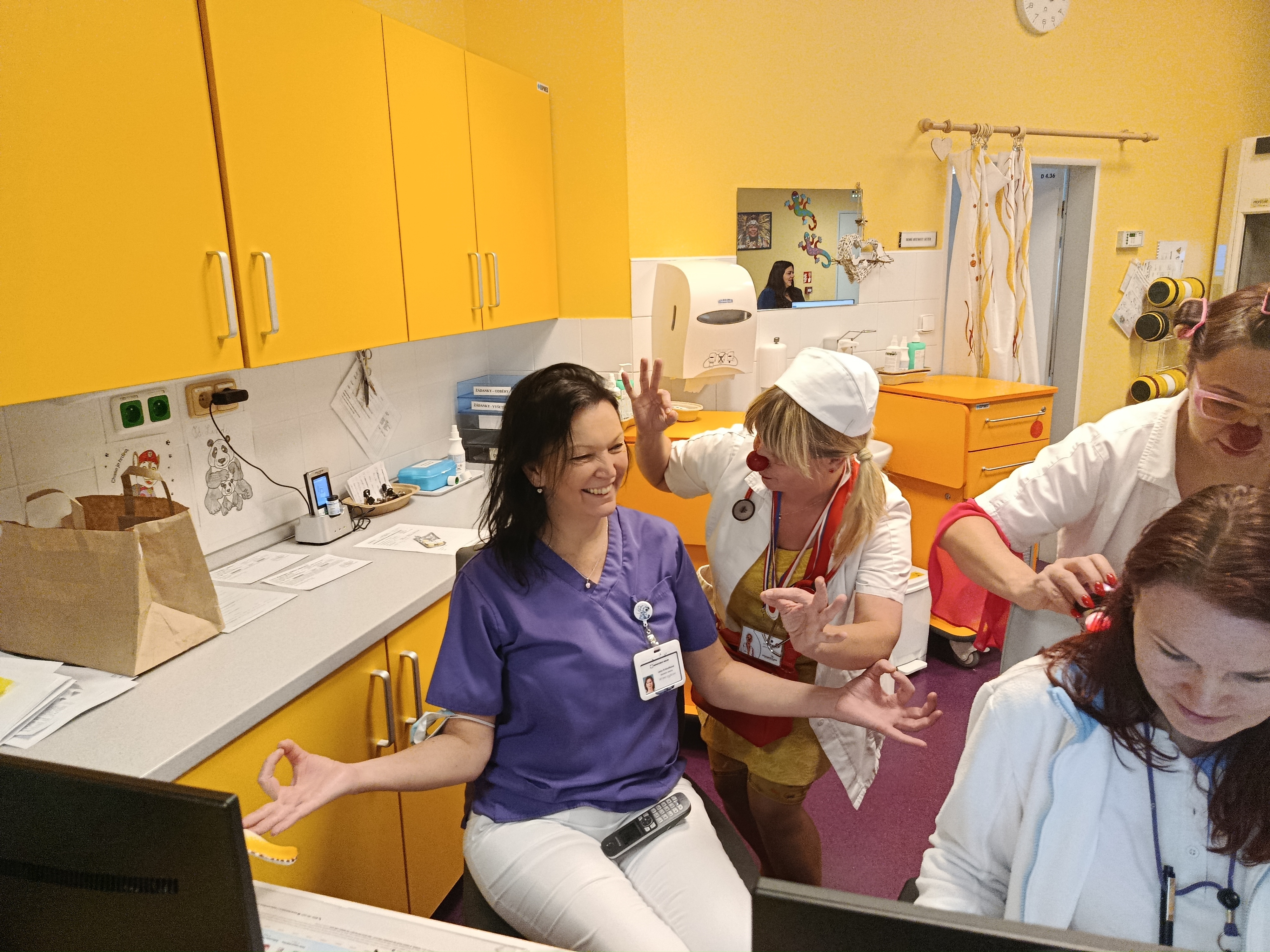 Nemusí to být ale jen speciální den, kdy myslíme na sestry a lékaře. Stačí nám k tomu i běžná klauniáda, která začíná právě návštěvou personálu. Nejen, že od nich zjišťujeme důležité informace o pacientech, ale věnujeme se i jim samotným. Písničkou, vyslechnutím, úsměvem nebo třeba speciální klaunskou masáží.